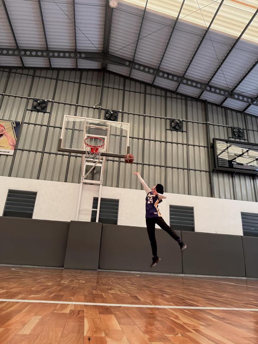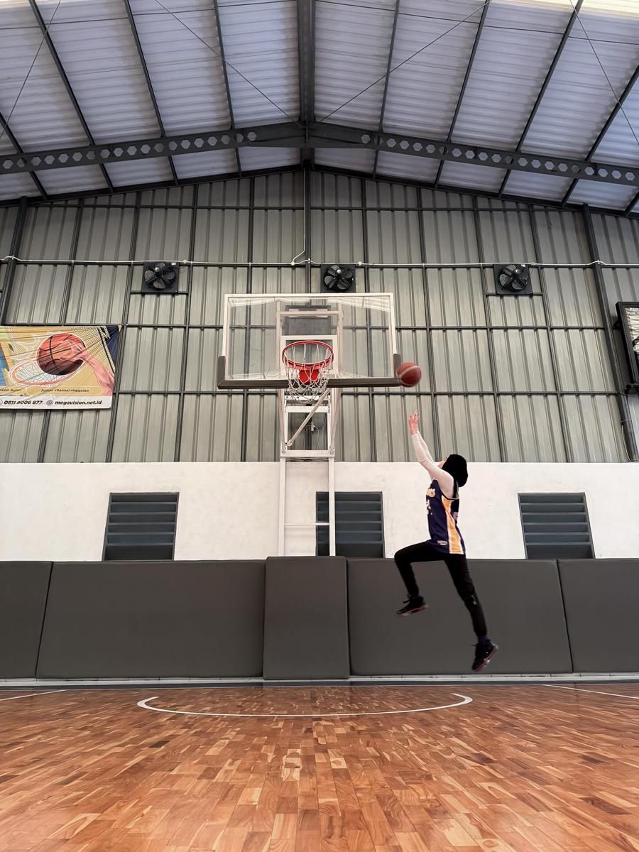 5. Ia mencoba melompat sembari melempat bola basket. Siapa sangka bola pun masuk dengan mudahnya