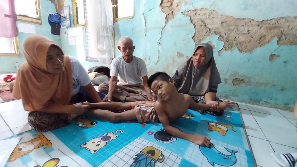 Kakinya dibungkukkan seperti ini agar tidak sakit, agar Hadijah tidak kembali merasakan nyeri. Jika berobat menggunakan BPJS, tetapi untuk transportasinya tidak ada biaya. Hanya bisa naik motor biasanya tiga orang, Hadijah di tengah. Bila sedang mengalami kejang, kami hanya duduk di tengah jalan seperti orang gila,” tambahnya.