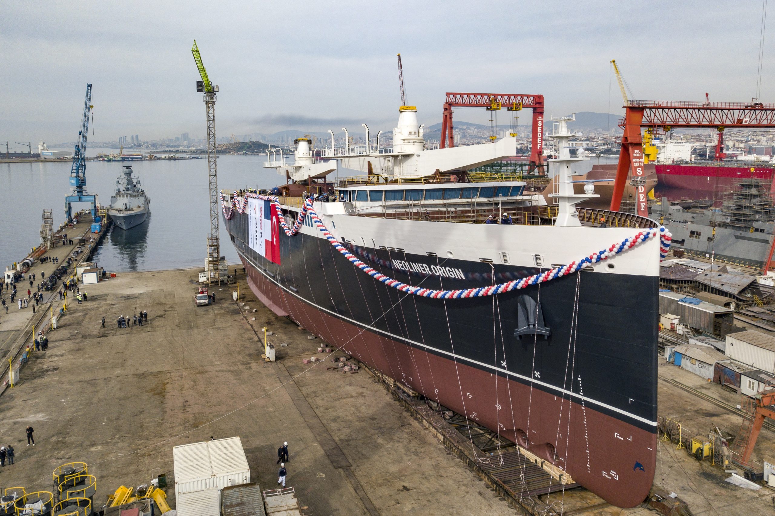 The image below shows the world’s longest wind-powered cargo ship, Neoliner Origin, during its christening on January 30, 2025, in the Turkish port of Tuzla, located outside Istanbul. Neoliner Origin was designed by the French company Neoline and built by the Turkish shipyard RMK Marine. It was a mammoth project spanning more than 12 years.