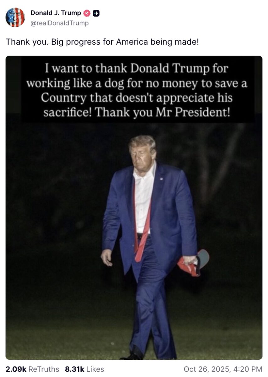 It’s exact caption reads: “I want to thank Donald Trump for working like a dog for no money to save a Country that doesn’t appreciate his sacrifice! Thank you Mr President!”